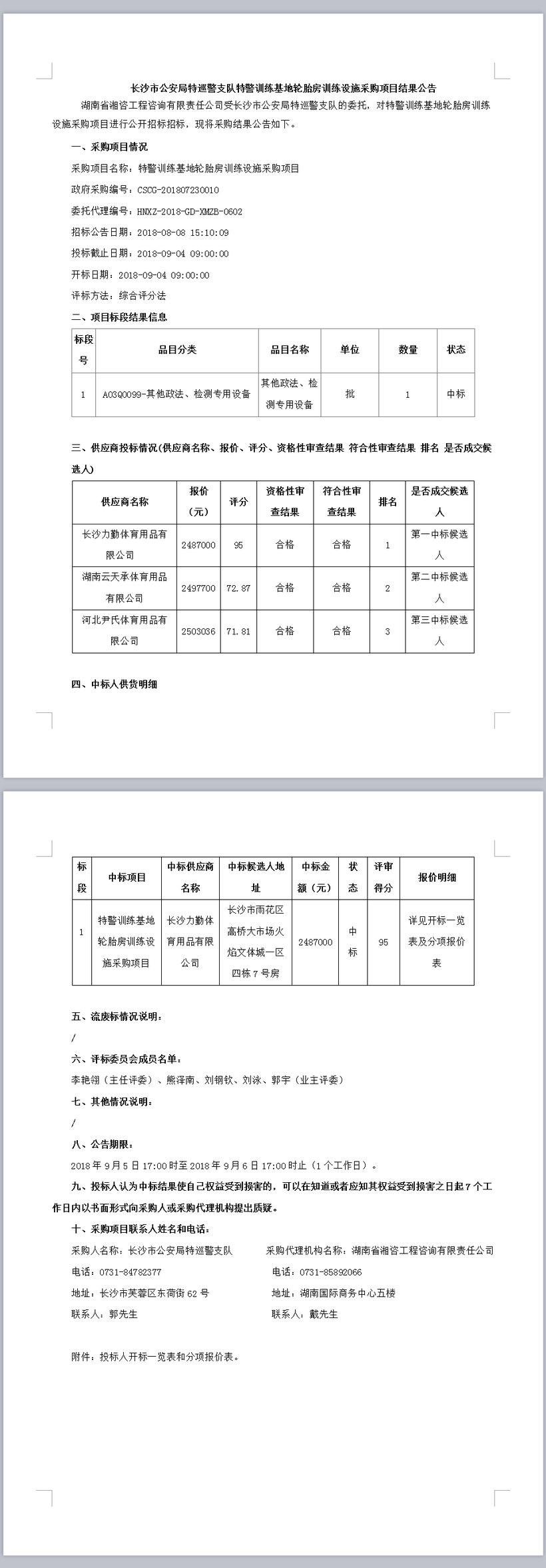 长沙市公安局特巡警支队特警训练基地轮胎房训练设施采购项目结果公告