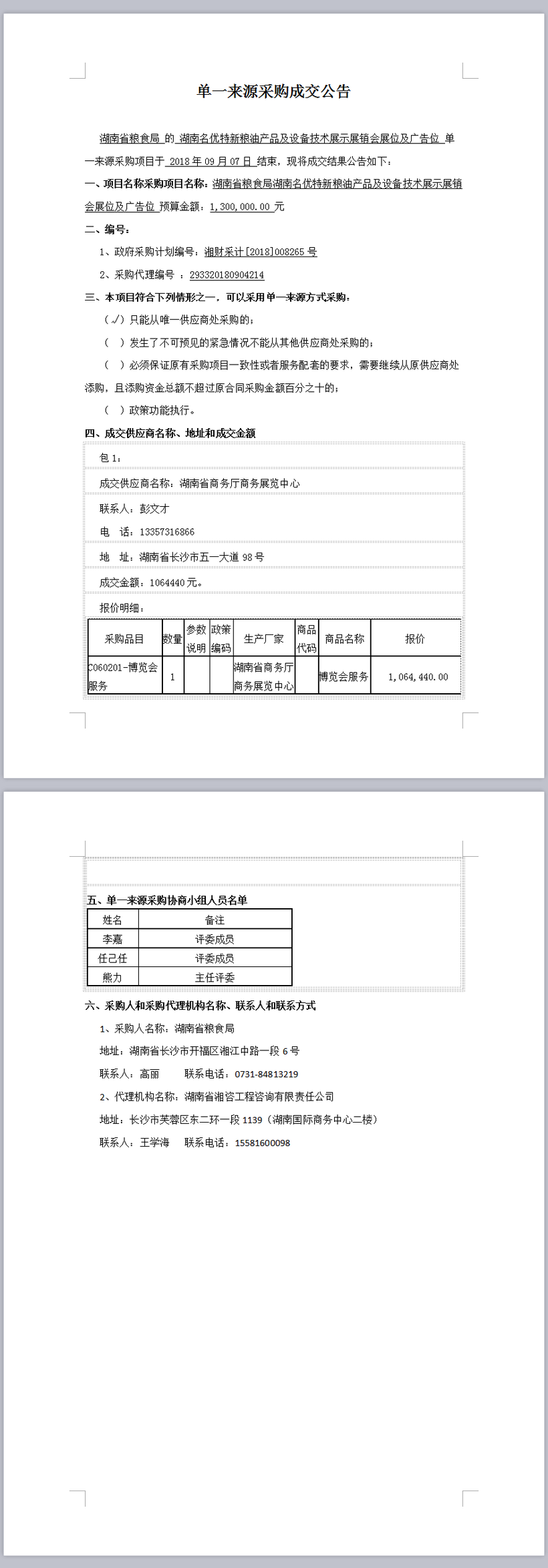 湖南省粮食局湖南名优特新粮油产品及设备技术展示展销会展位及广告位单一来源采购成交公告