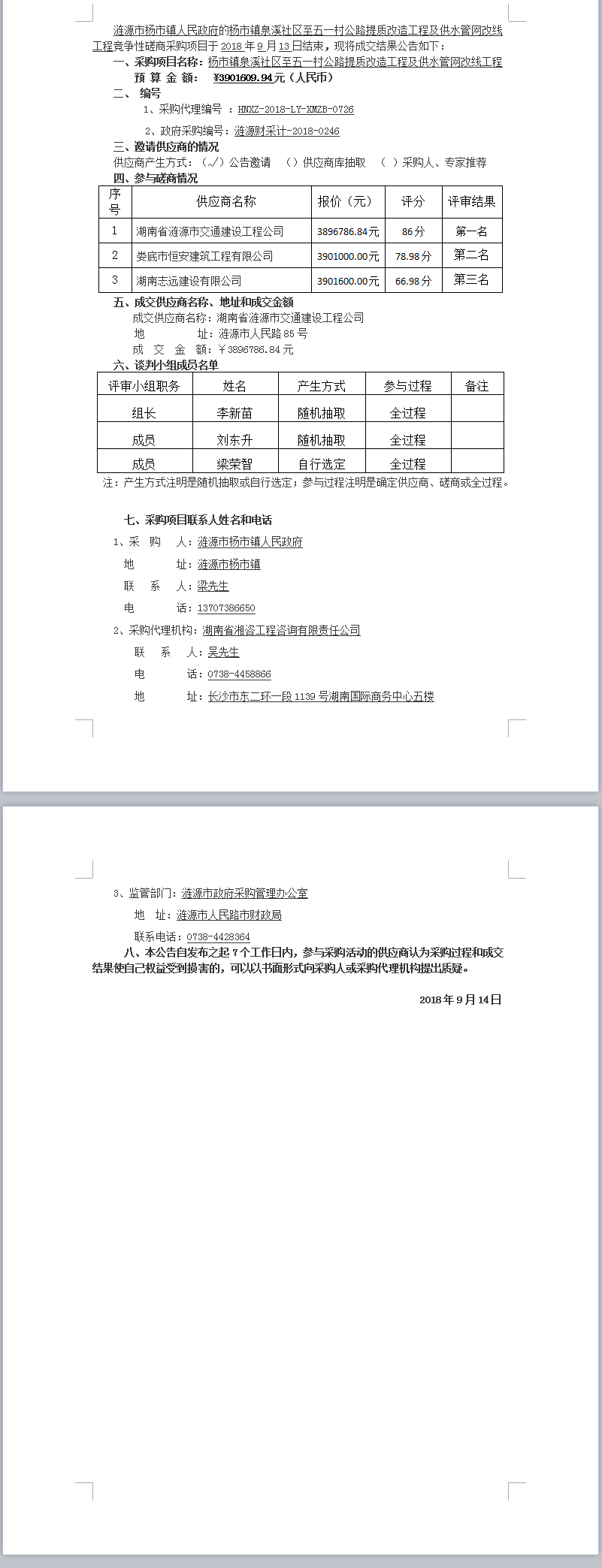 杨市镇泉溪社区至五一村公路提质改造工程及供水管网改线工程竞争性磋商成交结果公告