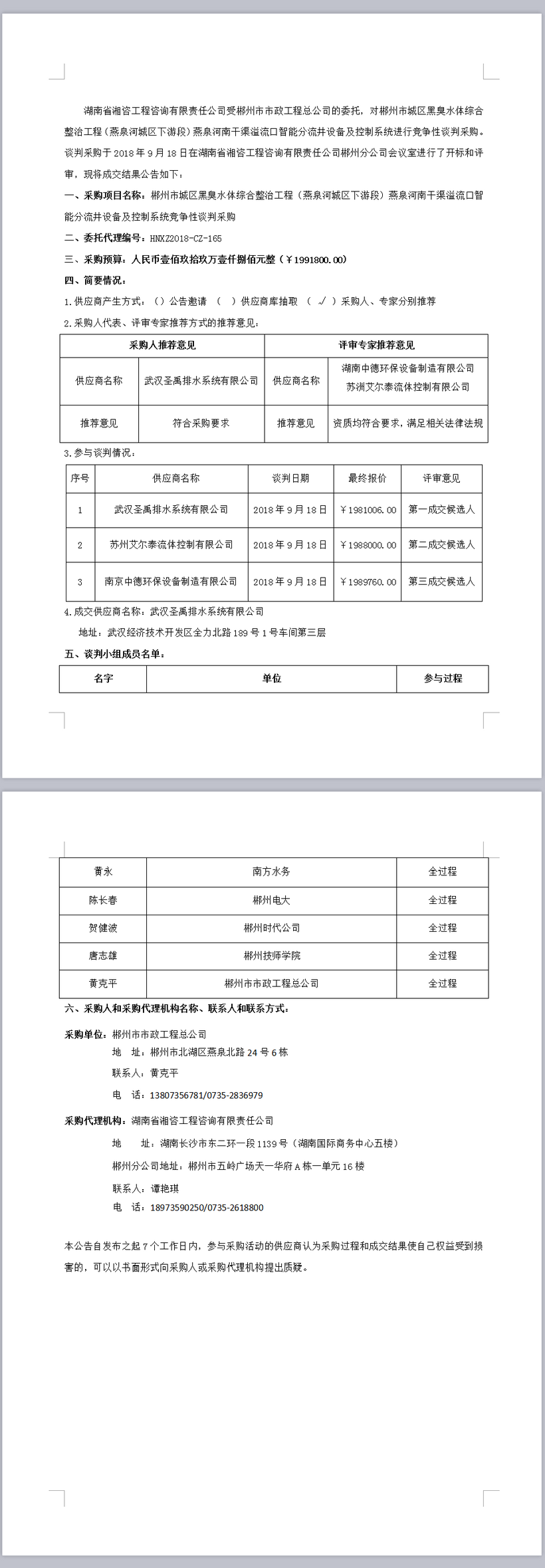 郴州市城区黑臭水体综合整治工程(燕泉河城区下游段)燕泉河南干渠溢流口智能分流井设备及控制系统竞争性谈判采购成交公告