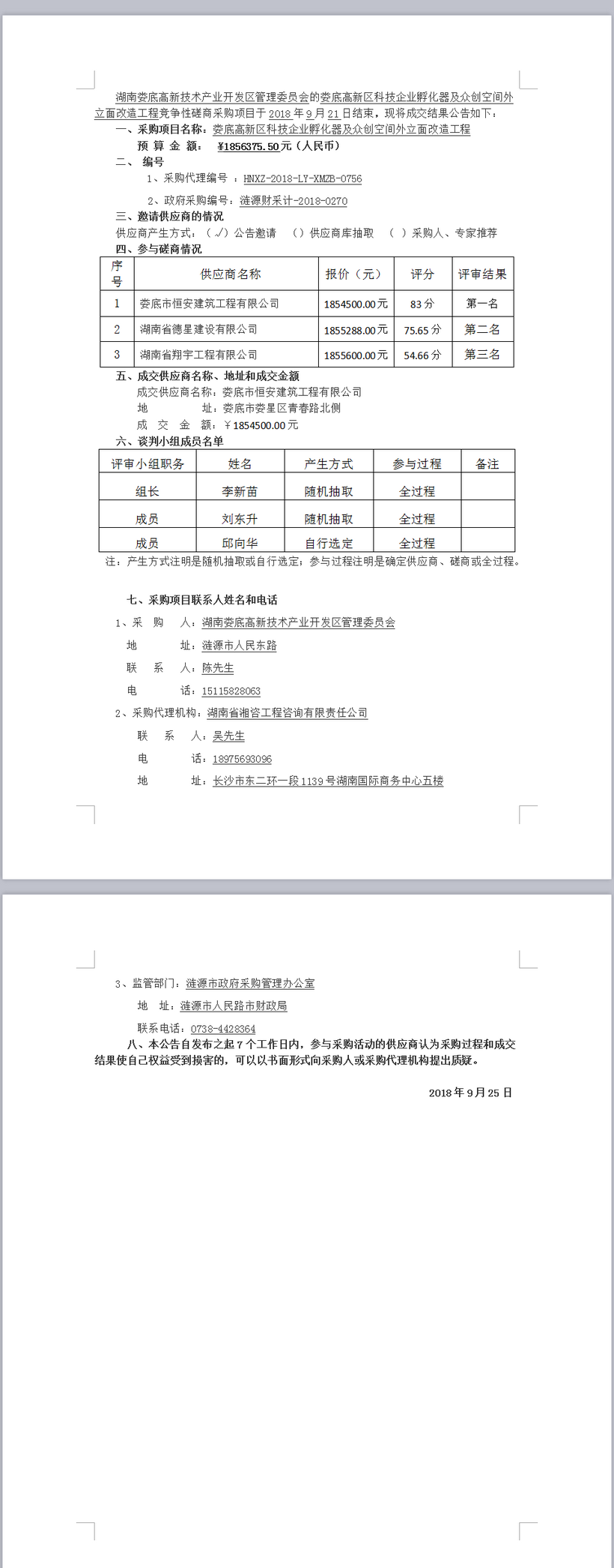 娄底高新区科技企业孵化器及众创空间外立面改造工程竞争性磋商成交公告