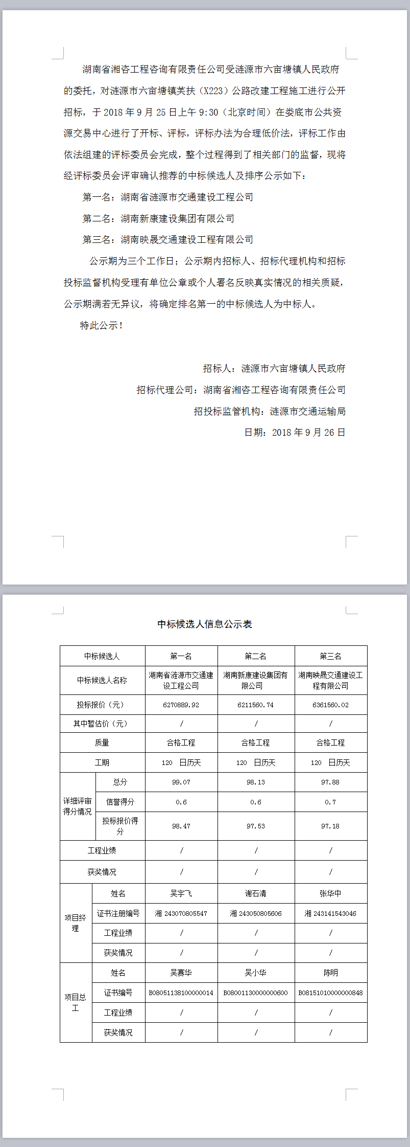涟源市六亩塘镇芙扶(X223)公路改建工程施工中标候选人公示