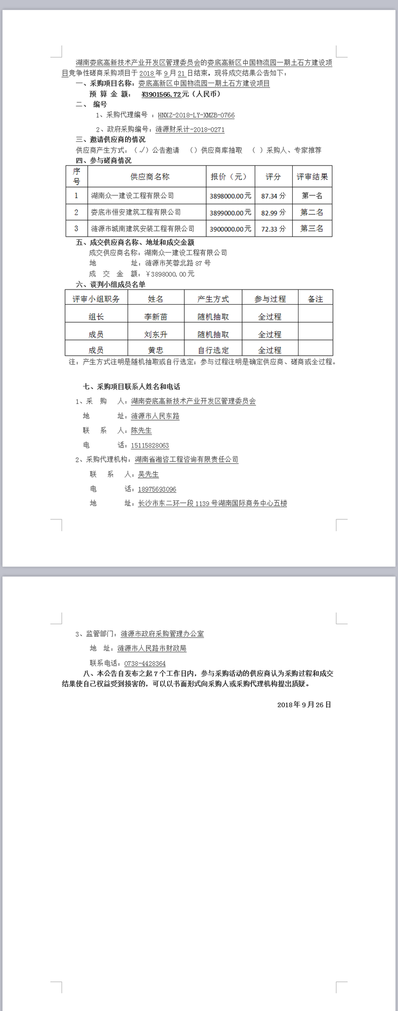娄底高新区中国物流园一期土石方建设项目竞争性磋商成交结果公告