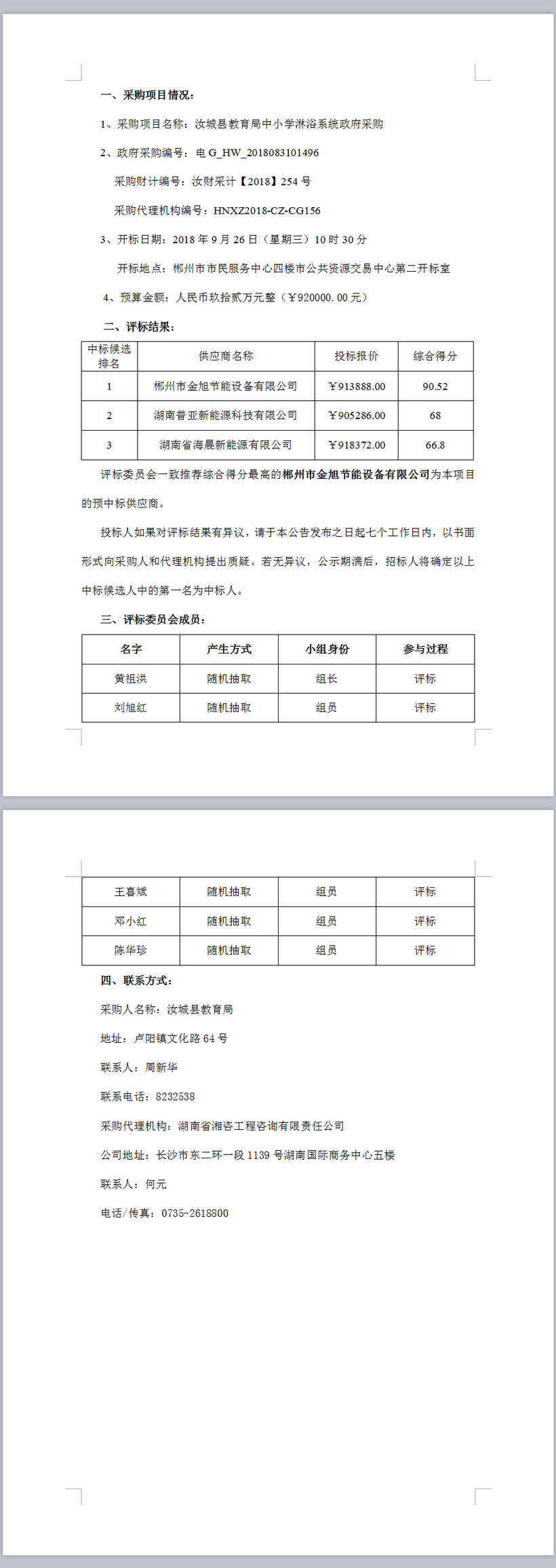 汝城县教育局中小学淋浴系统政府采购中标结果公示
