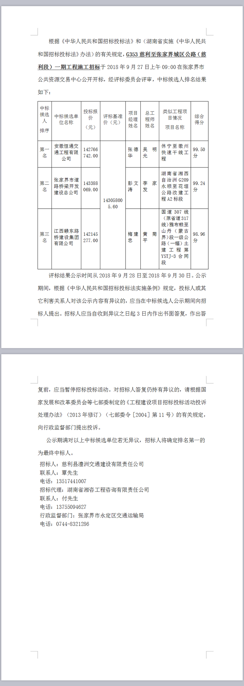 G353慈利至张家界城区公路(慈利段)一期工程施工招标中标候选单位公示