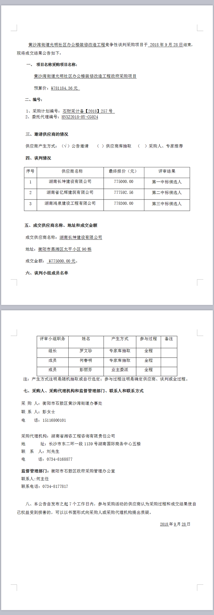 黄沙湾街道光明社区办公楼装修改造工程政府采购项目竞争性谈判成交结果公告
