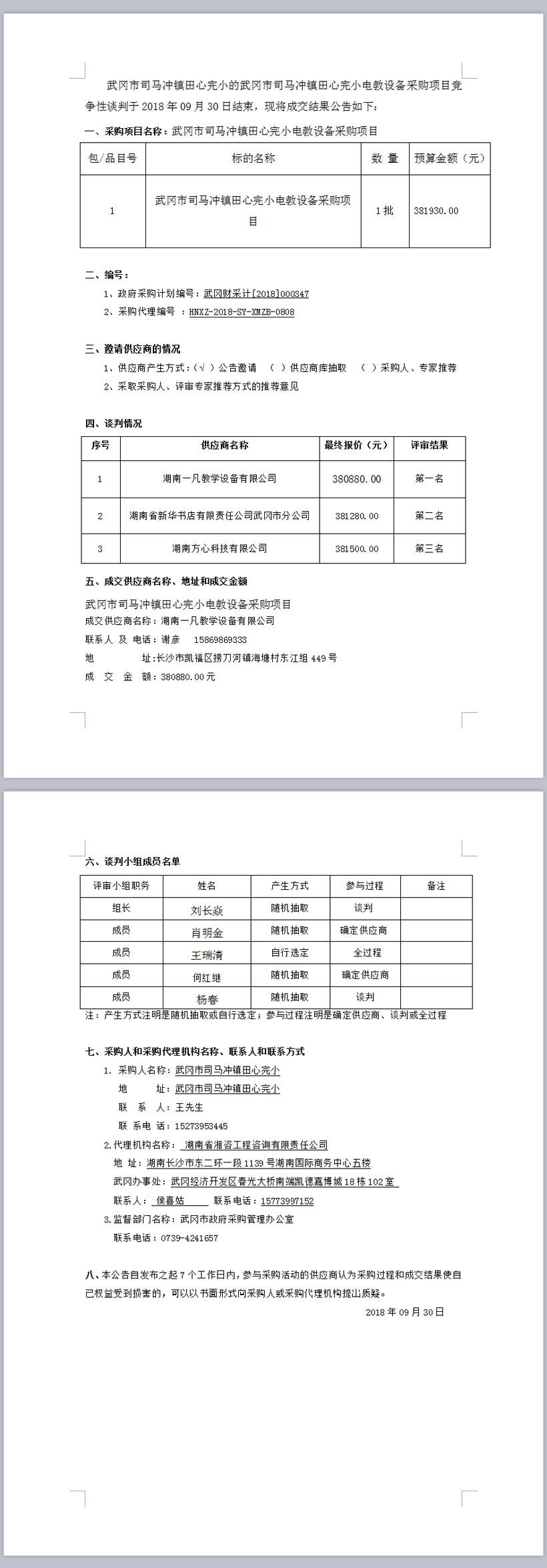 武冈市司马冲镇田心完小电教设备采购项目 竞争性谈判成交结果公