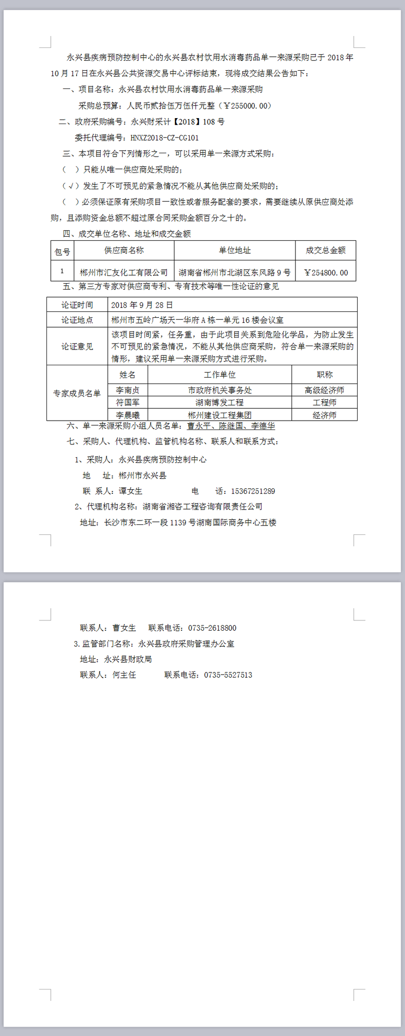 永兴县农村饮用水消毒药品单一来源采购成交公告