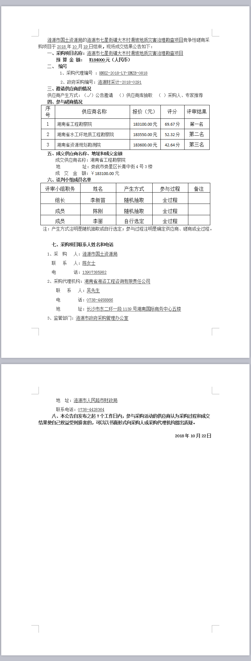 涟源市七星街镇大木村滑坡地质灾害治理勘查项目竞争性磋商成交结果公告
