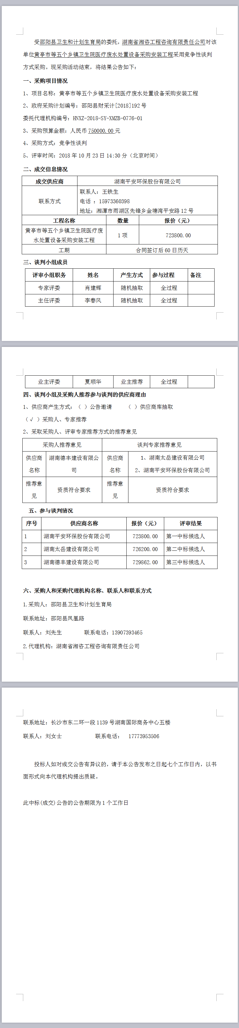 黄亭市等五个乡镇卫生院医疗废水处置设备采购安装工程谈判成交公告