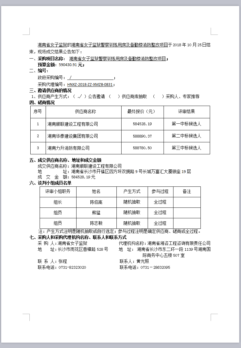 湖南省女子监狱警察训练用房及备勤楼消防整改项目成交结果公告