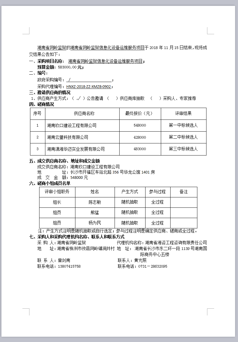 湖南省网岭监狱信息化设备运维服务项目成交结果公告