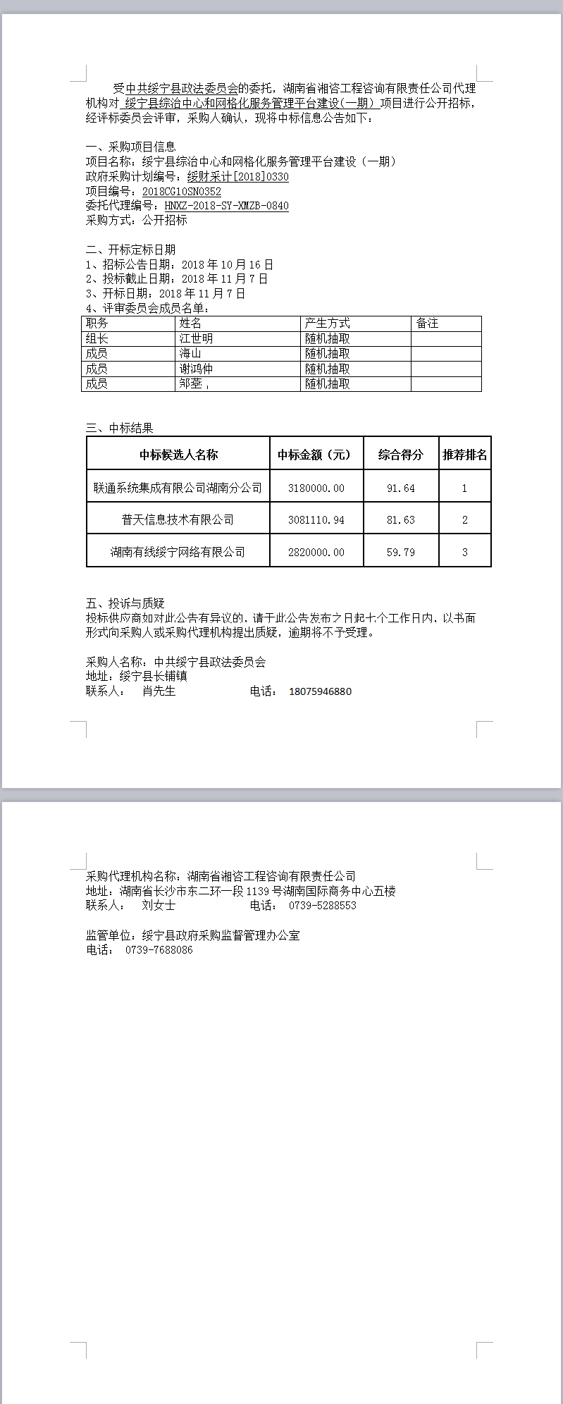 绥宁县综治中心和网格化服务管理平台建设(一期)成交公告