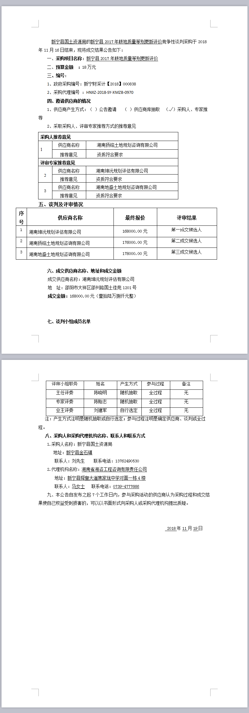 新宁县2017年耕地质量等别更新评价 竞争性谈判成交结果公告