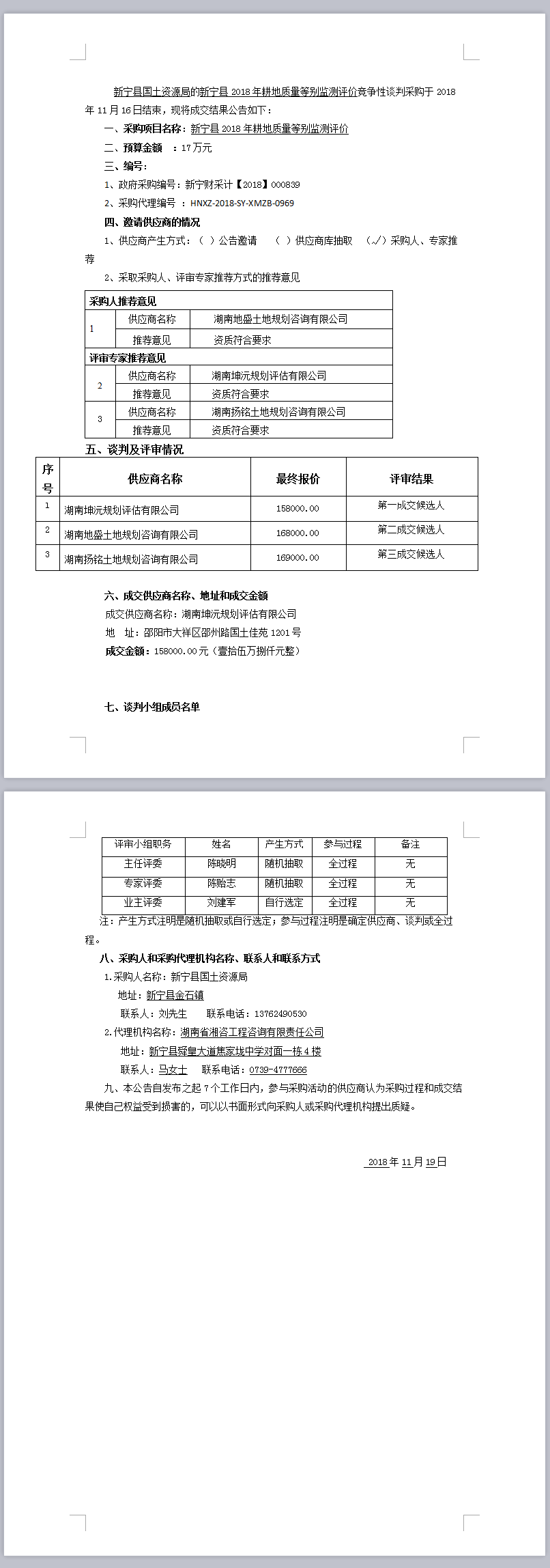 新宁县2018年耕地质量等别监测评价竞争性谈判成交结果公告