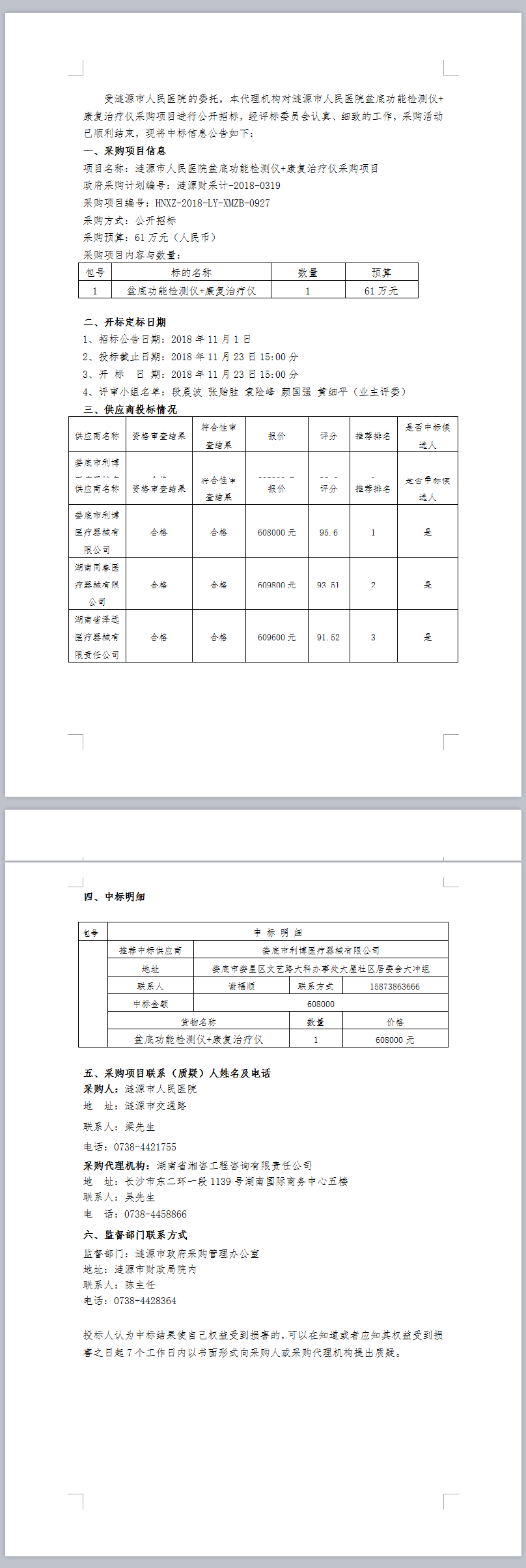 涟源市人民医院盆底功能检测仪+康复治疗仪采购项目中标结果公告