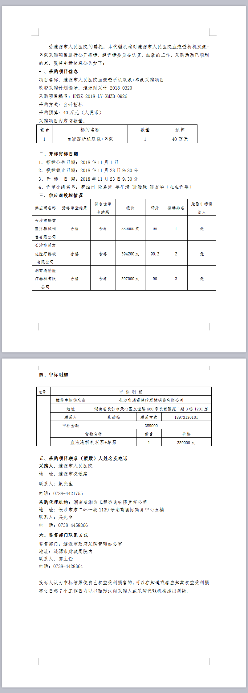 涟源市人民医院血液透析机双泵+单泵采购项目中标结果公告