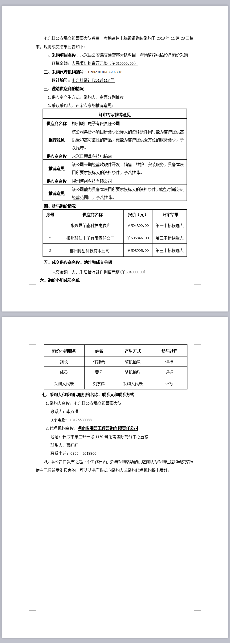 永兴县公安局交通警察大队科目一考场监控电脑设备询价采购成交结果公告
