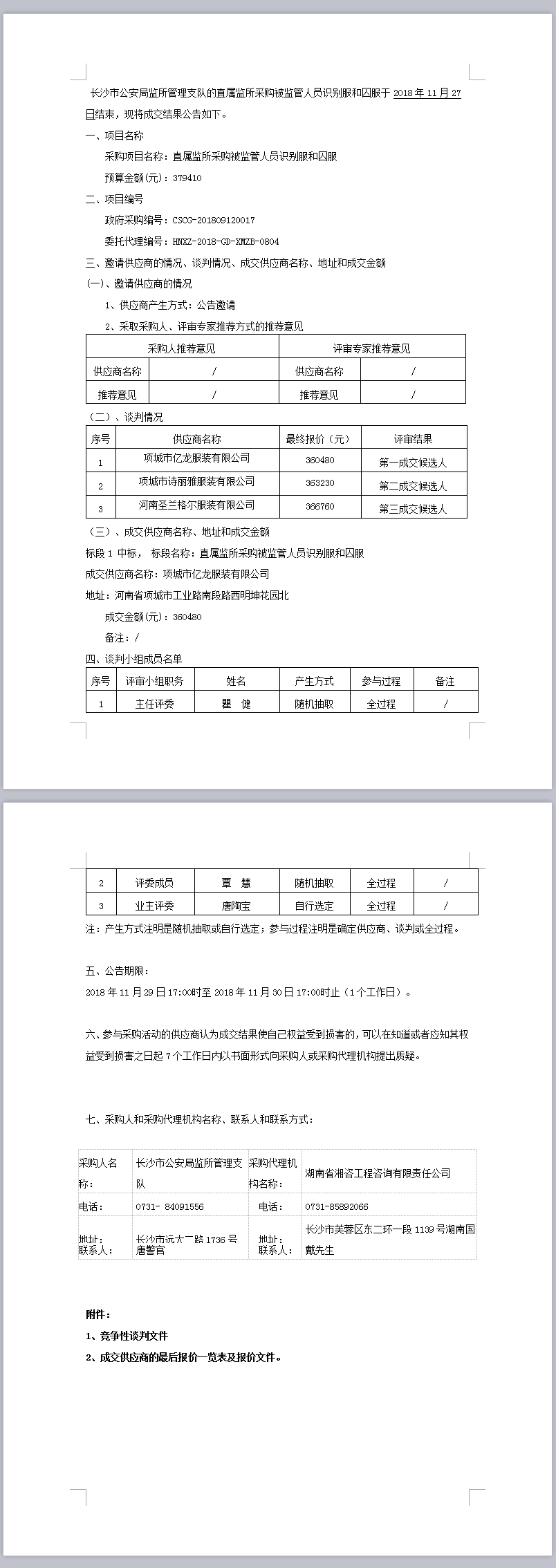 长沙市公安局监所管理支队直属监所采购被监管人员识别服和囚服(第二次)结果公告