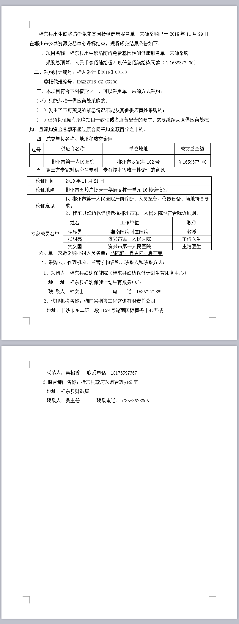 桂东县出生缺陷防治免费基因检测健康服务单一来源采购成交公告