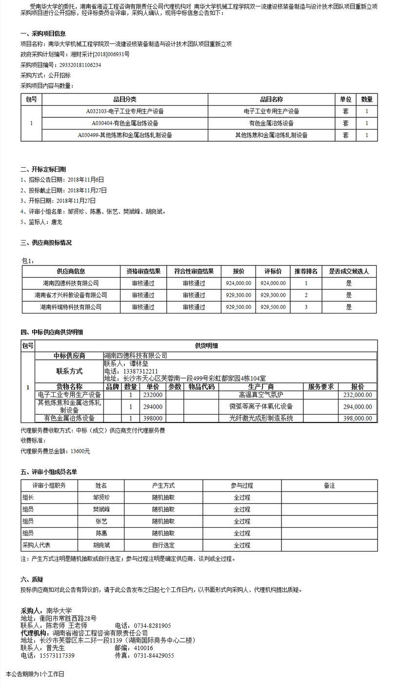 南华大学机械工程学院双一流建设核装备制造与设计技术团队项目重新立项公开招标中标公告