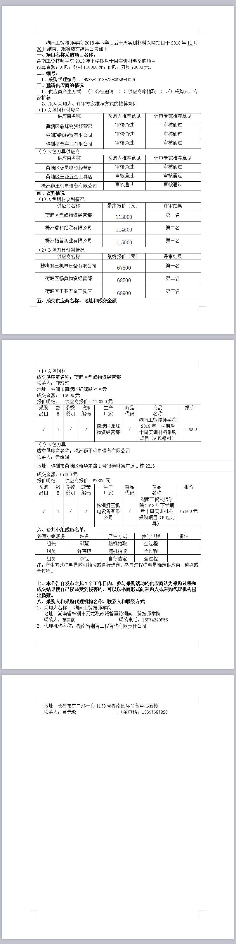 湖南工贸技师学院2018年下学期后十周实训材料采购项目竞争性谈判成交公告