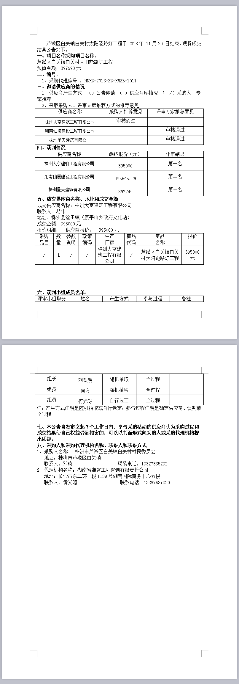 芦淞区白关镇白关村太阳能路灯工程 竞争性谈判成交公告