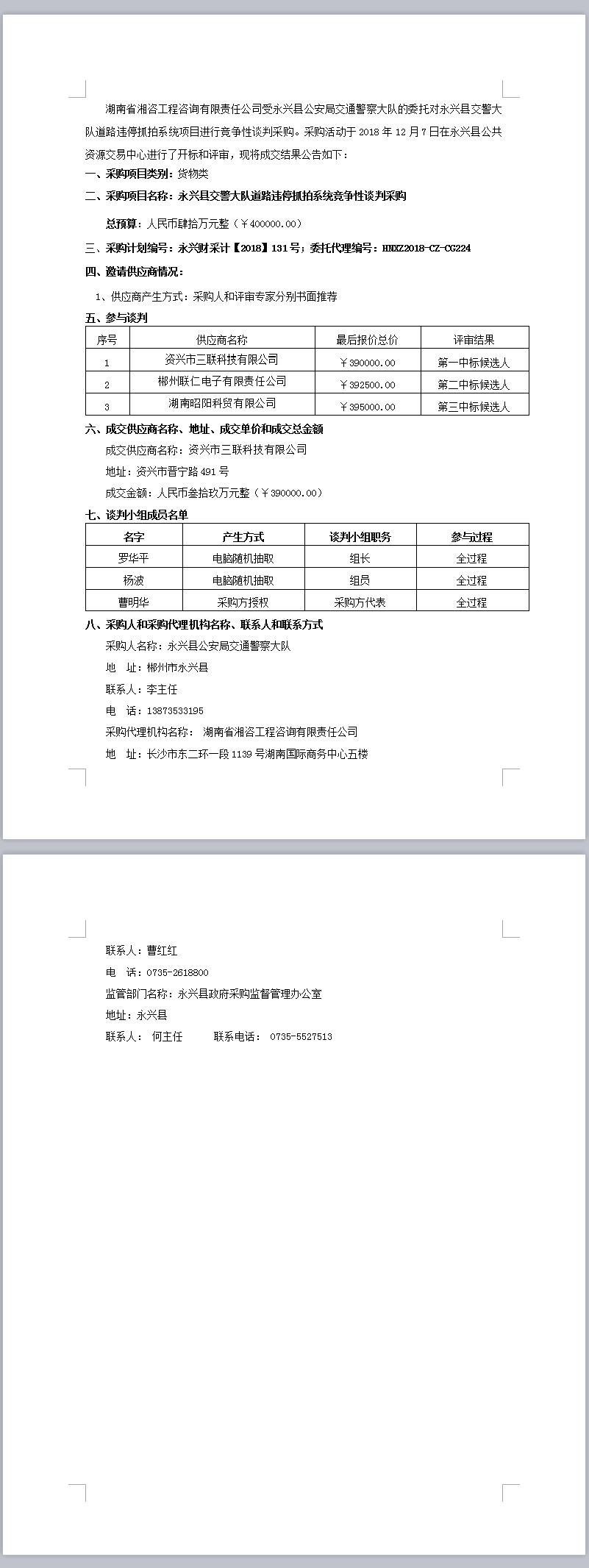 永兴县交警大队道路违停抓拍系统竞争性谈判采购成交公告