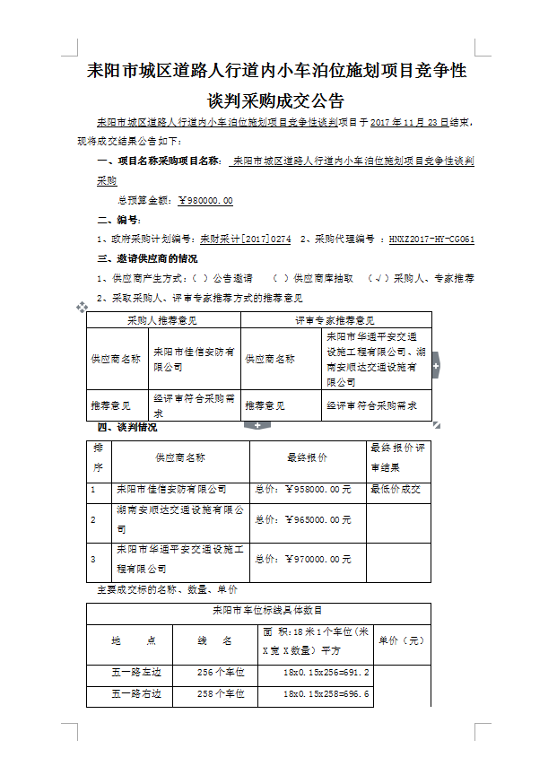 耒阳市城区道路人行道内小车泊位施划项目竞争性谈判采购成交公告