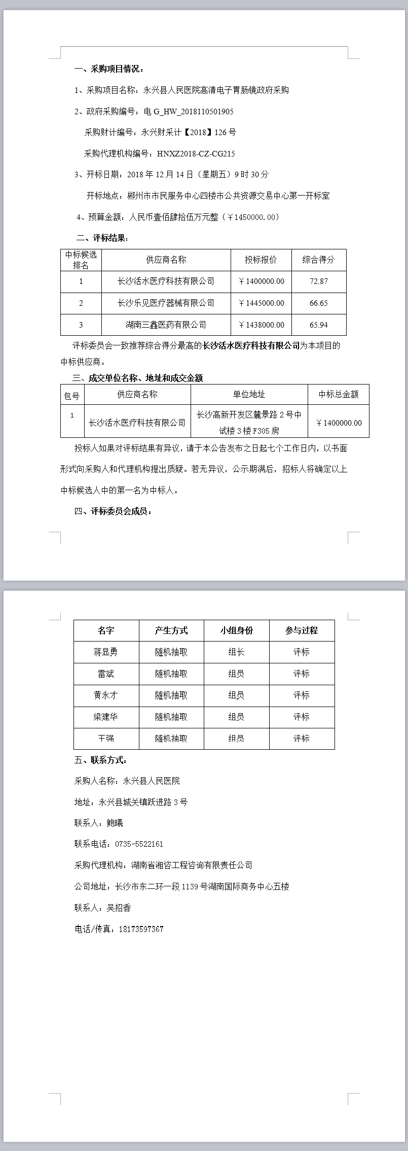 永兴县人民医院高清电子胃肠镜政府采购中标结果公示