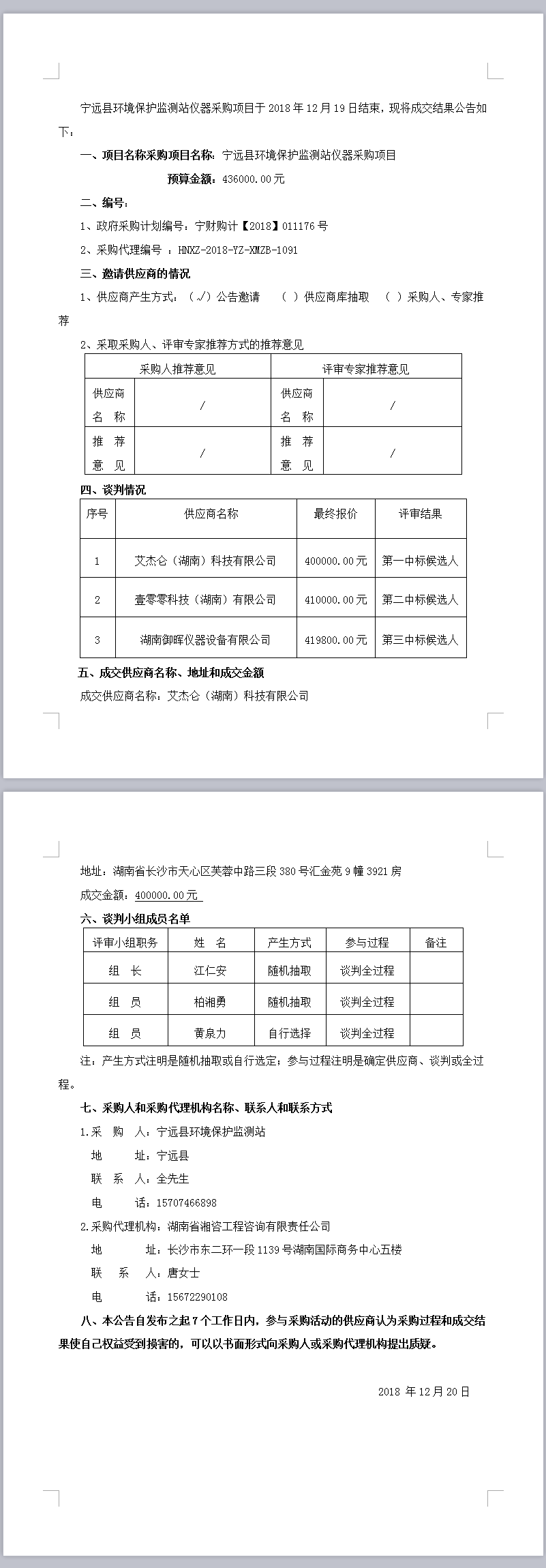 宁远县环境保护监测站仪器采购项目 竞争性谈判成交结果公告