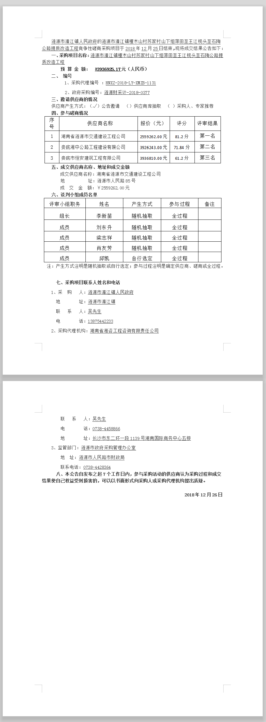 涟源市湄江镇檀木山村苏家村山下组蒎田至王江枧头至石陶公路提质改造工程竞争性磋商成交结果公告