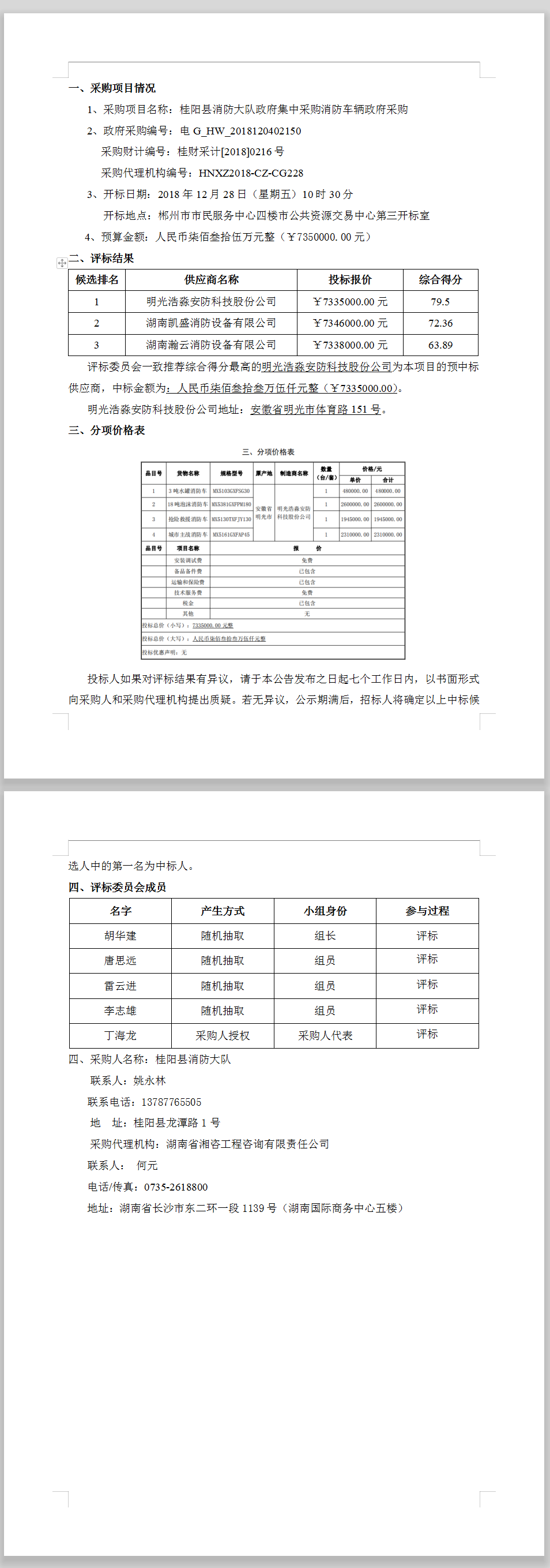 桂阳县消防大队政府集中采购消防车辆政府采购中标结果公示