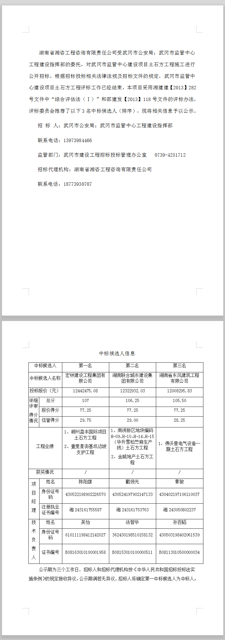 武冈市监管中心建设项目土石方工程施工中标候选人公示