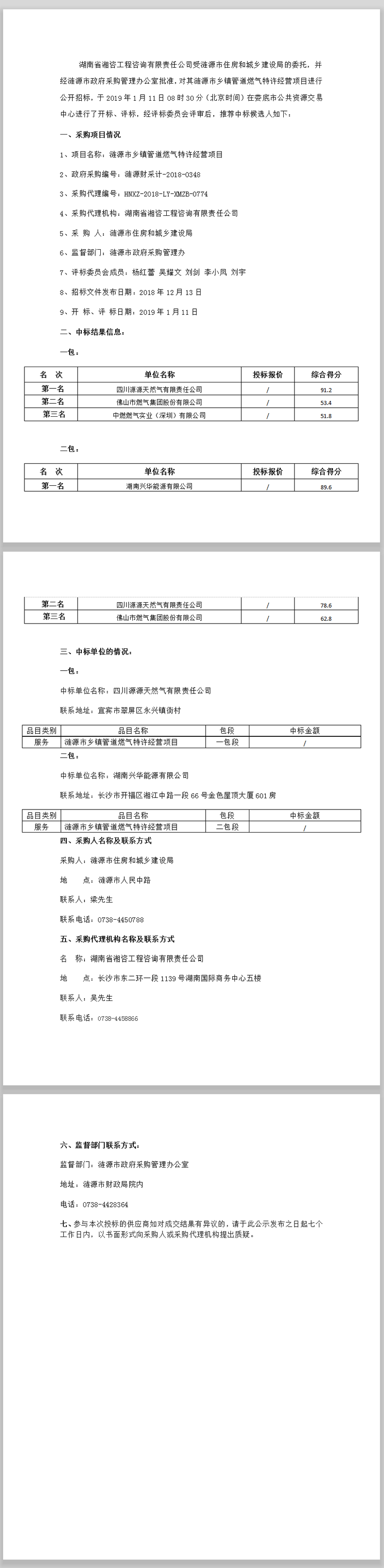涟源市乡镇管道燃气特许经营项目招标中标候选人公告