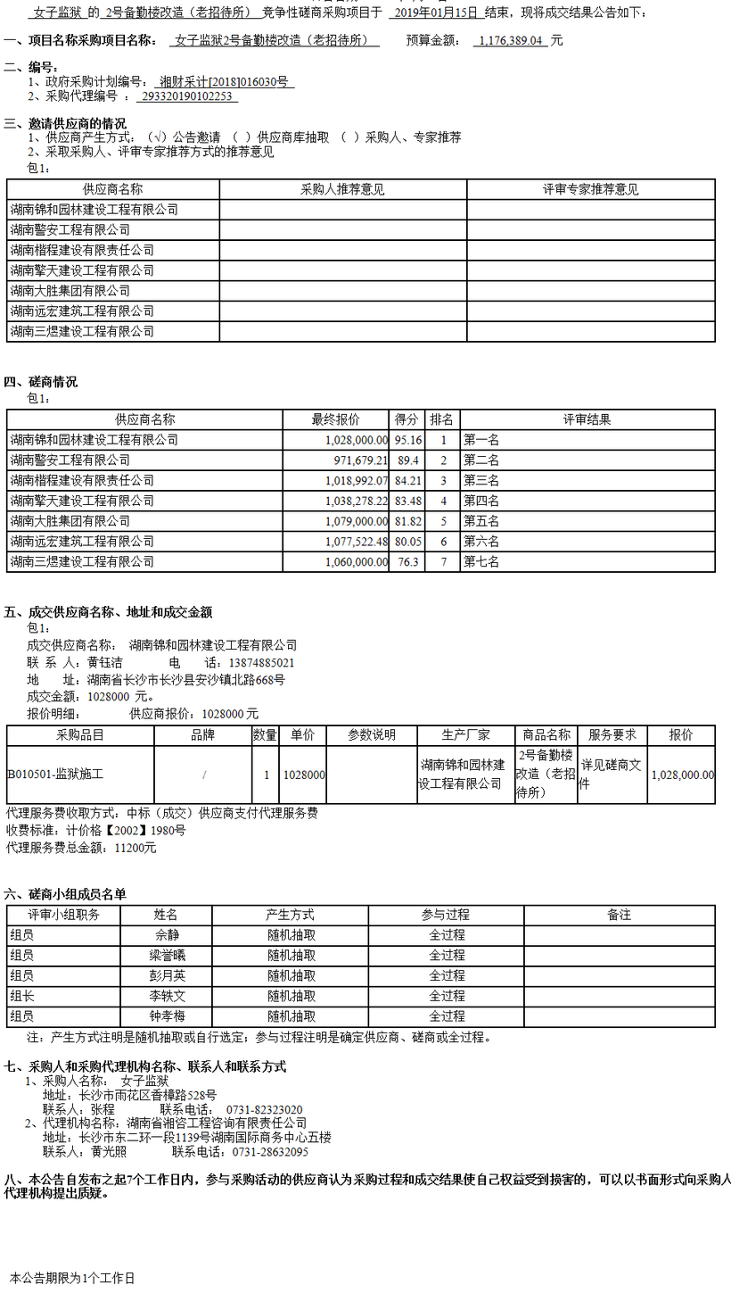 湖南省女子监狱2号备勤楼改造(老招待所)工程 项目成交结果公告