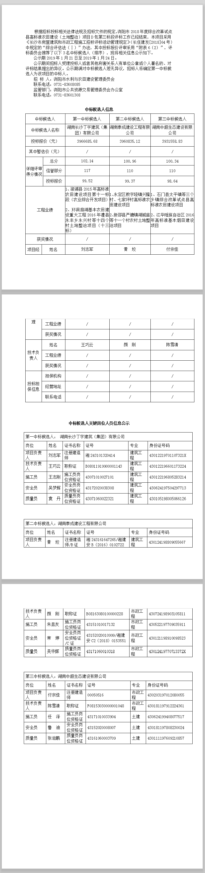 浏阳市2018年度综合改革试点县高标准农田建设(土地整治)项目D包第三标段中标候选人公示