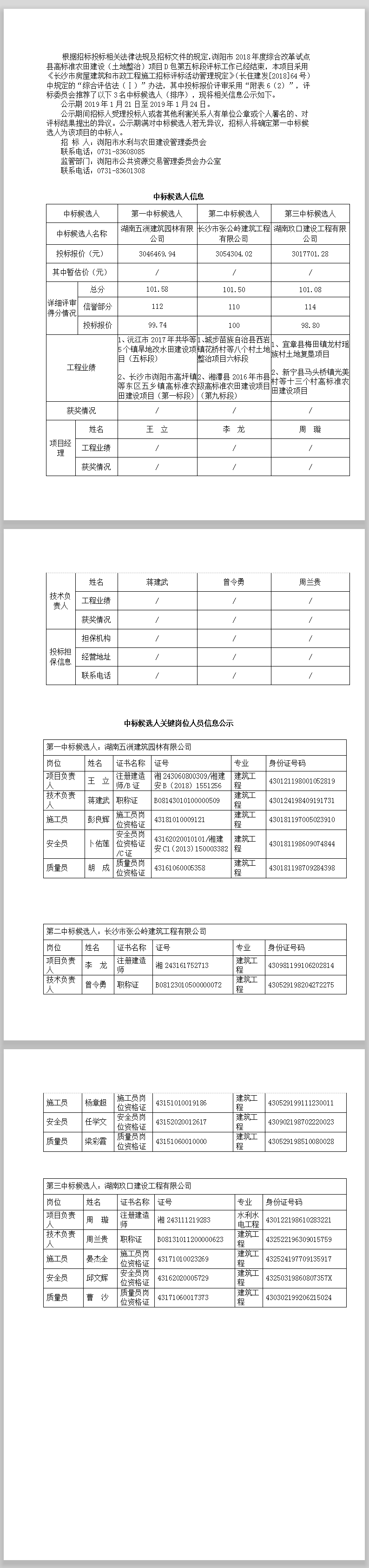 浏阳市2018年度综合改革试点县高标准农田建设(土地整治)项目D包第五标段 中标候选人公示
