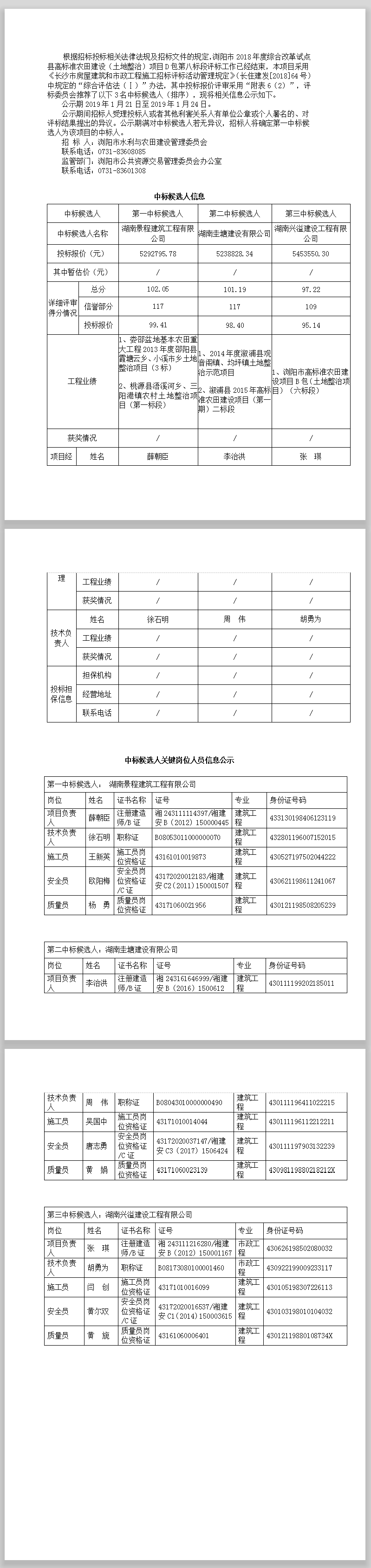浏阳市2018年度综合改革试点县高标准农田建设(土地整治)项目D包第八标段 中标候选人公示