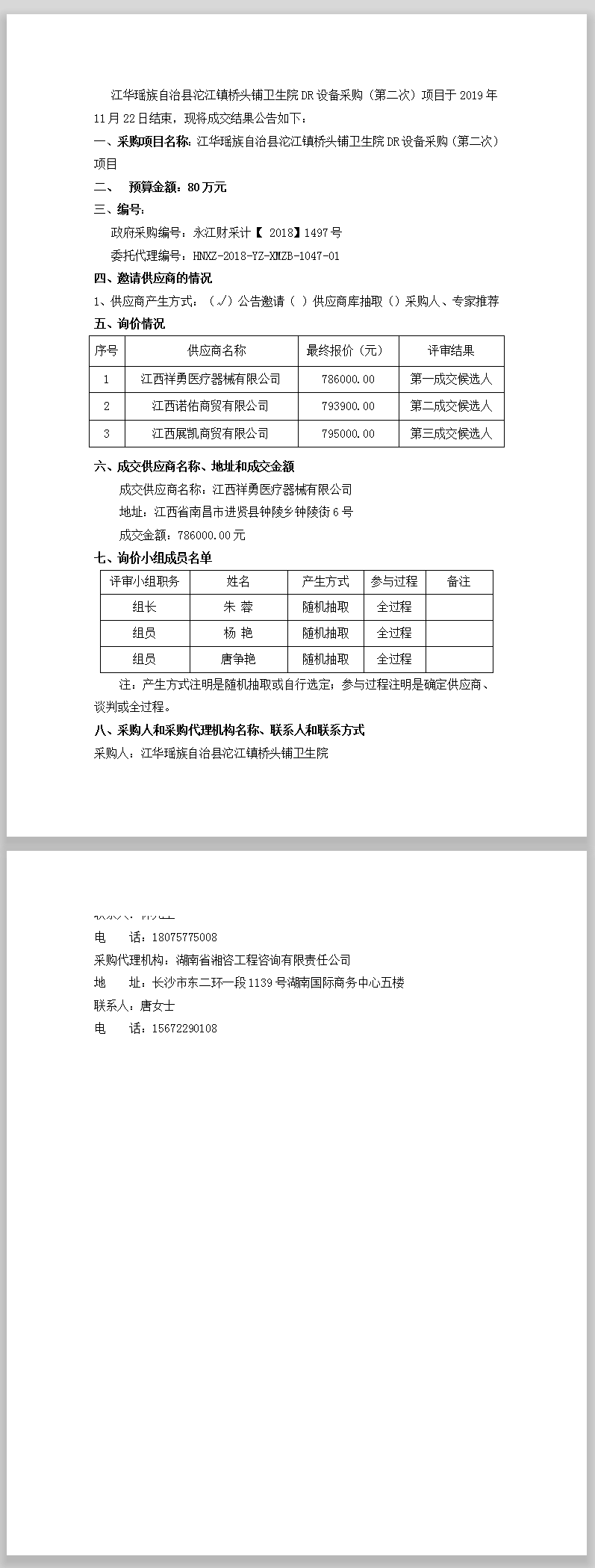 江华瑶族自治县沱江镇桥头铺卫生院 DR设备采购(第二次)成交结果公告