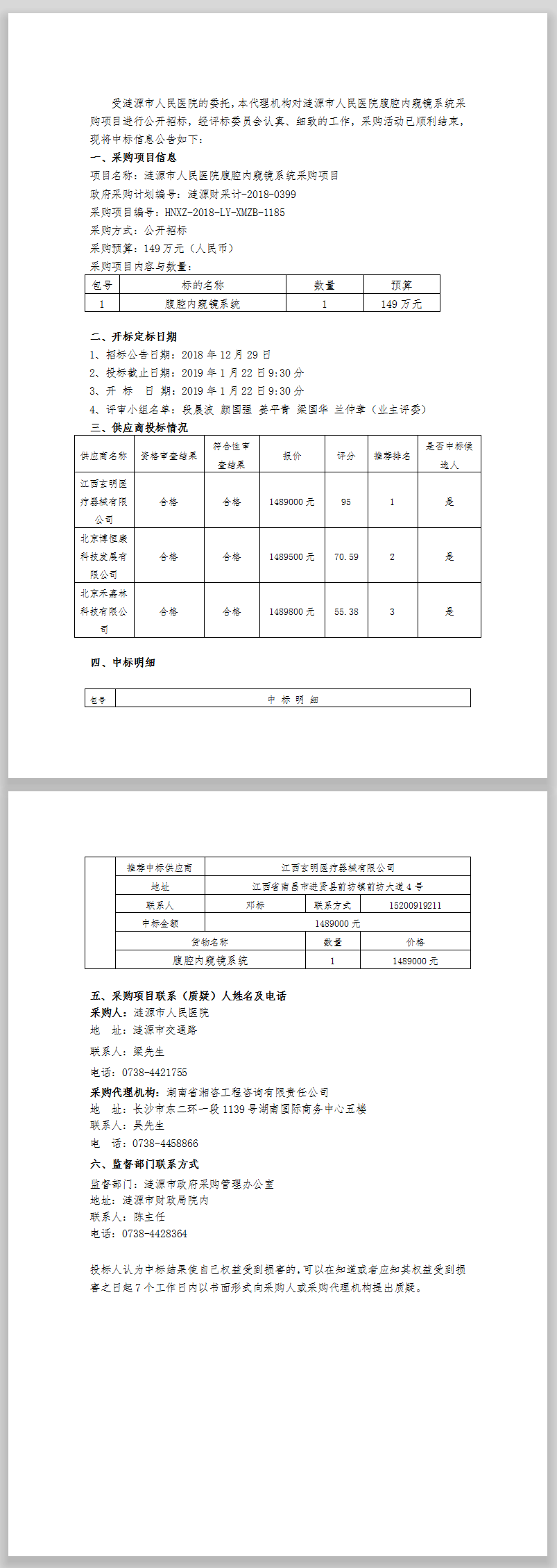 涟源市人民医院腹腔内窥镜系统采购项目中标结果公告