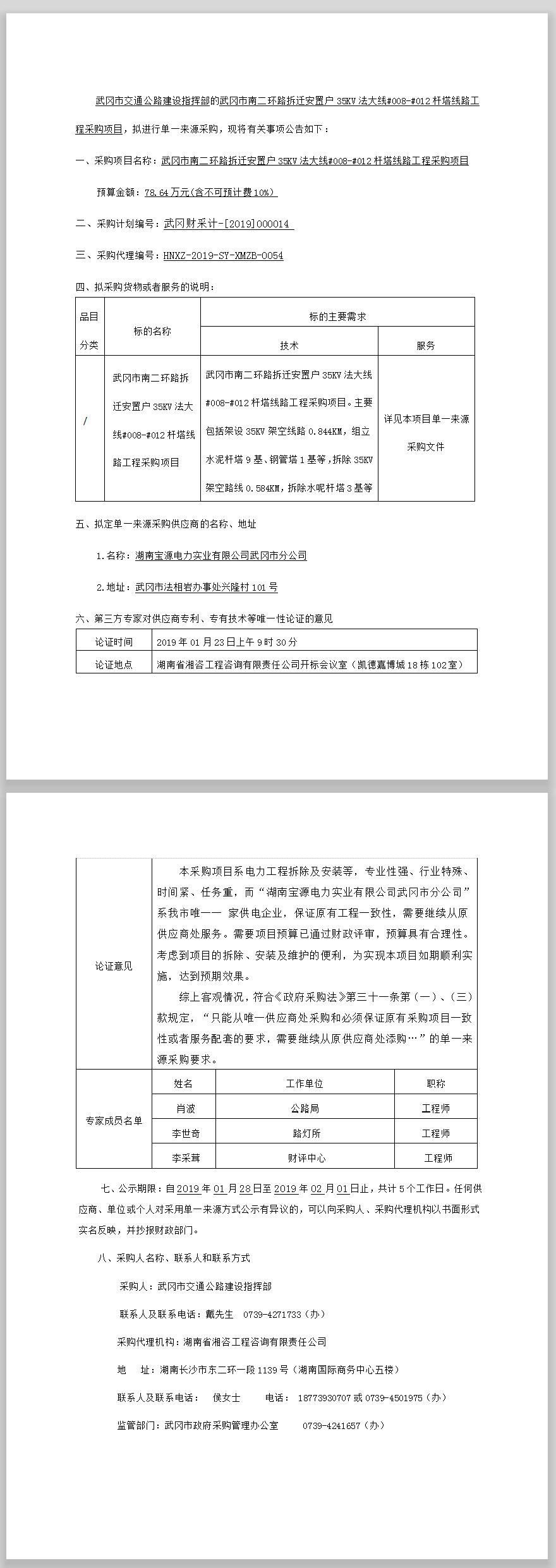 武冈市南二环路拆迁安置户35KV法大线#008—#012杆塔线路工程采购项目单一来源采购公示