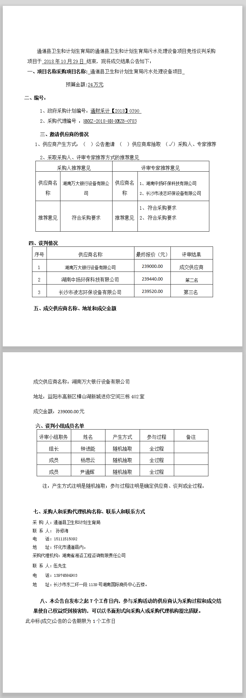 通道县卫生和计划生育局污水处理设备项目采购谈判成交公告