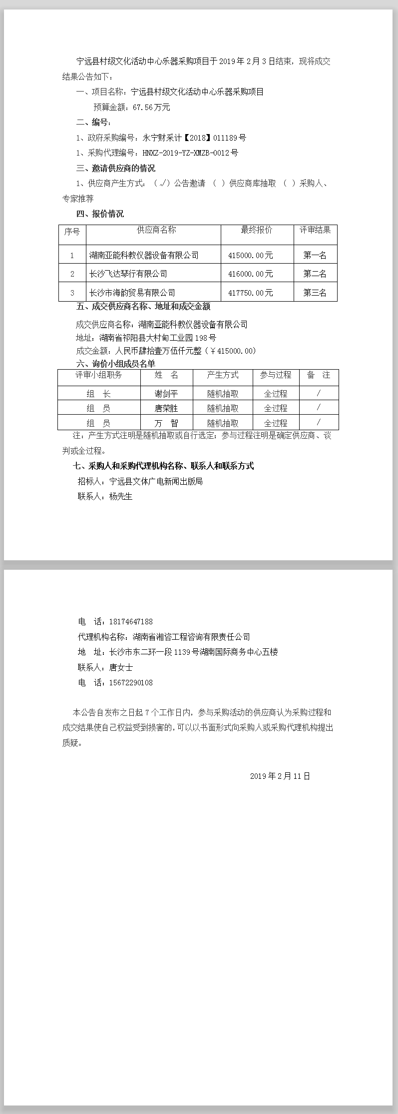 宁远县村级文化活动中心乐器采购项目 询价采购成交结果公告