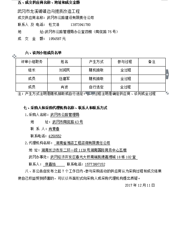 武冈市龙溪铺镇边沟提质改造工程 竞争性谈判成交结果公告