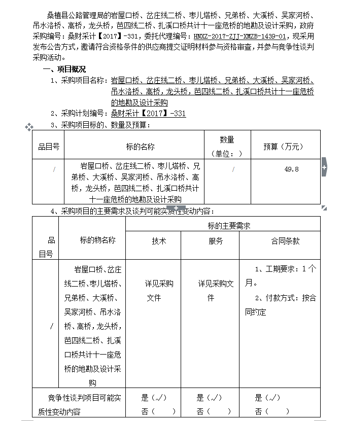 岩屋口桥、岔庄线二桥、枣儿塔桥、兄弟桥、大溪桥、吴家河桥、吊水洛桥、高桥,龙头桥,芭四线二桥、扎溪口桥共计十一座危桥的地勘及设计采购 谈判公告