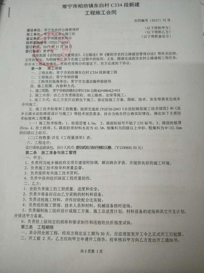 常宁市柏坊镇东白村C334段新建工程合同公示