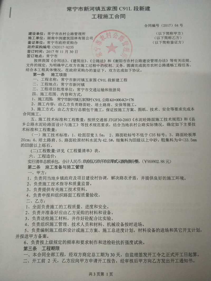 常宁市新河镇五家围村C91L段新建工程合同公示