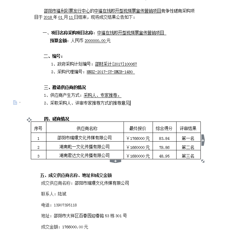 中福在线即开型视频票宣传营销项目 竞争性磋商成交公告