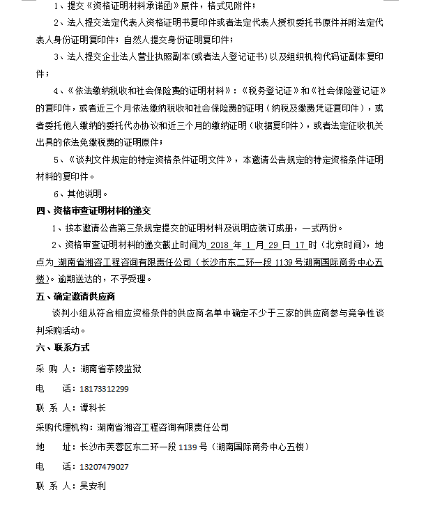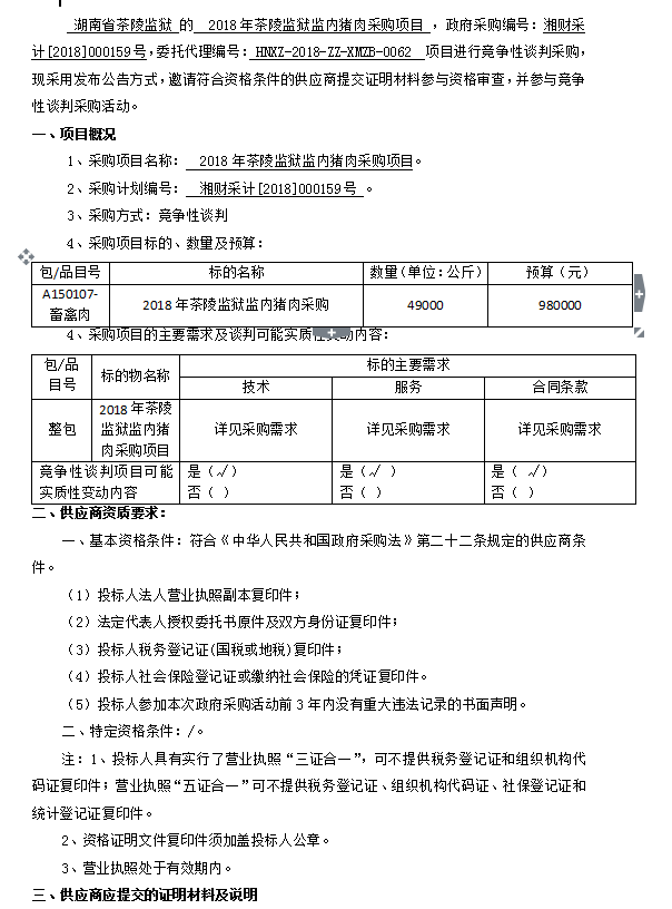 2018年茶陵监狱监内猪肉采购项目招标公告